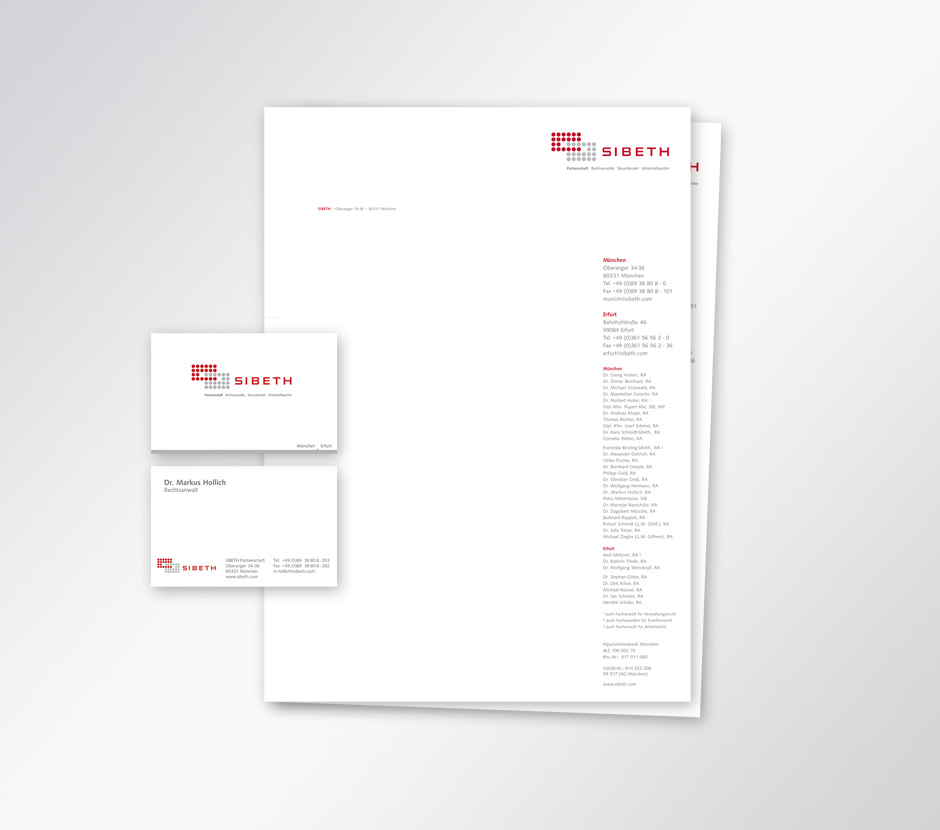 SIBETH Rechtsanwälte ist eine große Kanzlei mit Sitz in München, Frankfurt und Berlin. Das Thema Jura darf nicht immer nur klassisch und streng präsentiert werden. Der Mut zu anderen Farben und ungewöhnlichen Bildern zeigt sich in der Imagebroschüre und anderen Werbemittel.